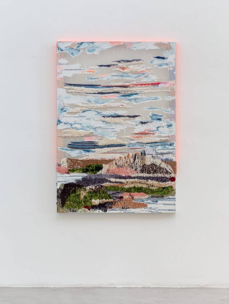 Outra artista que tem suas raízes na moda é a italiana Laura Villarosa. Natural de Palermo, que hoje vive em Niterói, no Rio de Janeiro, a artista tem as paisagens naturais como inspiração para suas composições pictóricas, combinando pinceladas com bordados e outras técnicas têxteis. A partir das materialidades volumétricas, Villarosa consegue expandir a dimensão das telas, criando paisagens de relevo ricas em detalhes.