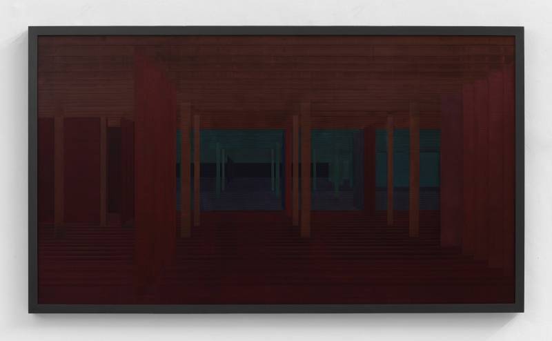 Em séries como “Labirinto Espelho” e “Labirintos Rizomáticos”, Janaina Mello Landini dá continuidade à sua pesquisa sobre tramas e entrelaçamentos, aqui realizadas em fitas de cetim. Nesta série, a perspectiva é construída a partir do olhar em movimento da artista durante seu percurso por um espaço real. Esse “poli-olho” registra de forma acumulativa tudo o que é visto, gerando a justaposição de volumes geométricos. A superposição dessas camadas cria uma perspectiva impossível, que reinventa o espaço e evidencia os múltiplos caminhos contidos em um único lugar. As fitas de cetim tingidas são presas apenas pelas bordas, em cálculo minucioso, alternando-se entre passar por cima e por baixo na trama. Sobre elas, uma camada de extrato de nogueira reduz o brilho intenso do material e cria um efeito que permite que o olhar penetre na composição.