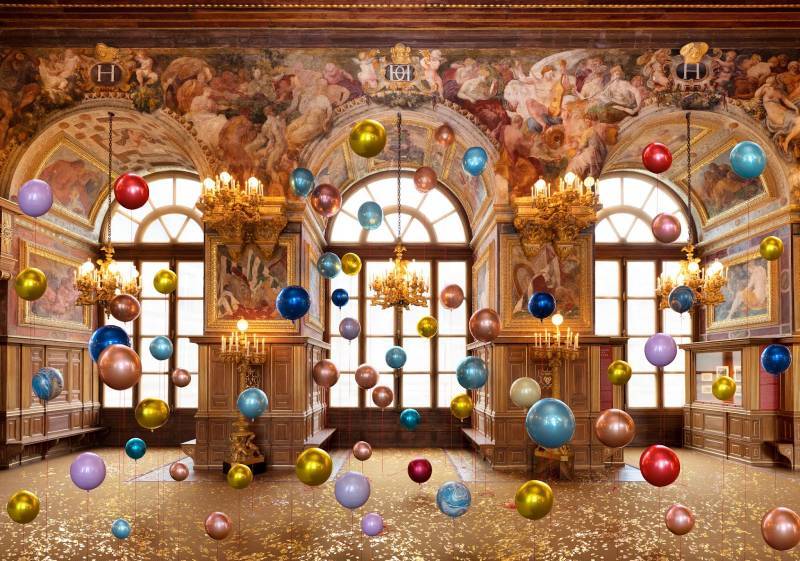 Para criar suas icônicas fotografias encenadas com balões coloridos, a primeira coisa que Flávia Junqueira precisa fazer é: escolher o local ideal para ser o fundo de seu cenário. A artista costuma escolher prédios históricos, como teatros e salas de ópera, mas você pode escolher o cômodo de sua casa que você mais gostar. Em seguida, ela enche diversos balões com gás hélio, mas na nossa atividade usaremos nosso fôlego para enchê-los. Lembre-se de pensar na paleta de cores das bexigas: elas podem ser uma de cada cor, monocromáticas, ou ainda em “tom sobre tom” – por exemplo, azuis claros e escuros.
