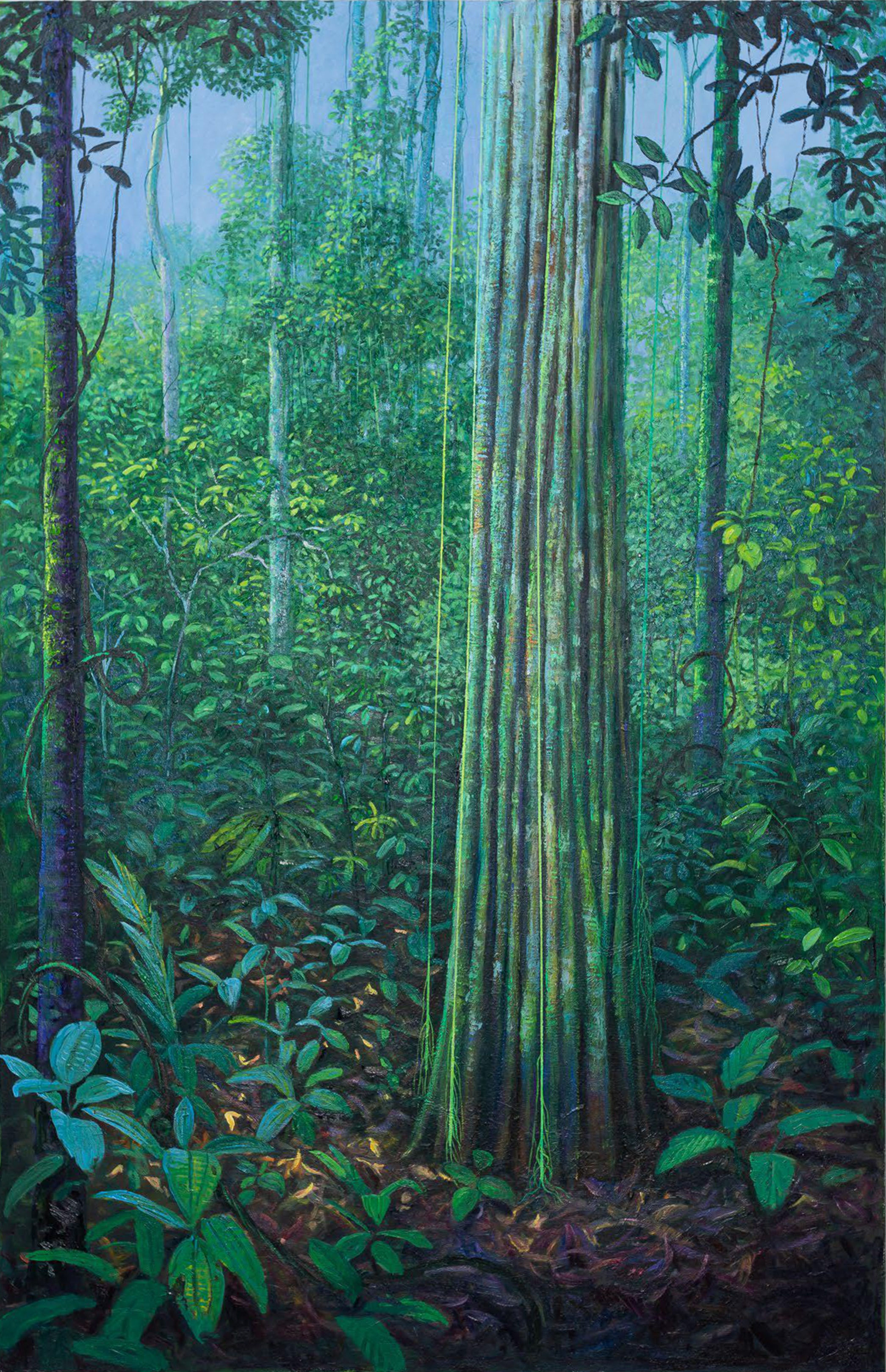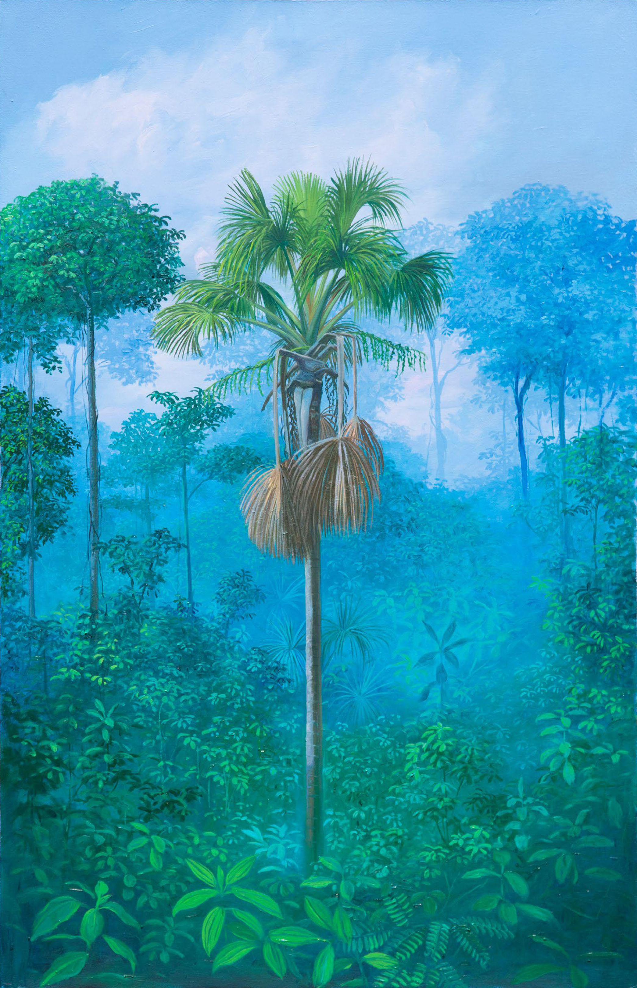 Autodidata, Miguel constrói uma pintura enraizada em sua experiência direta com os biomas do Cerrado, do Pantanal e da Amazônia. Filho de pai Xiquitano e mãe Bororo, o artista carrega em sua formação a escuta aos saberes tradicionais e uma vivência imersiva com os ciclos da natureza. Em sua pintura a floresta é protagonista, não como cenário, mas como linguagem viva.