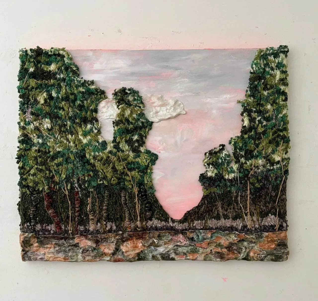 As linhas bordam a trama da mata, suas ramificações e raízes. Villarosa costura seu cultivo. A cerâmica, material que deriva de matérias-primas da terra, além de dialogar poeticamente com o motivo da composição, introduz a solidez em meio a organicidade natural. Já a tinta acrílica dá o tom do campo atmosférico celeste.