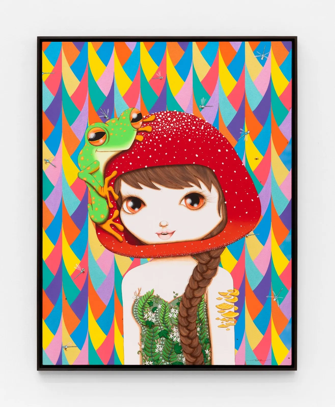 Com um estilo pictórico inconfundível, Nina Pandolfo (Tupã, Brasil, 1977) imagina em "Doçura" (2025) um universo onde a figura humana, fauna e flora sejam ainda mais indissociáveis. Na obra, moscas, libélulas e uma rã orbitam a personagem principal. A menina, vestida com folhas e pequenas flores, tem fungos brotando diretamente de seu braço e a cabeça transformada no topo de um cogumelo vermelho. Seus grandes olhos alaranjados também se assemelham aos do anfíbio que repousa sobre sua cabeça. “Doçura” encena uma mitologia a partir do corpo humano em simbiose com a natureza para pautar a interdependência ecológica e a ideia de força que provém do sensível.