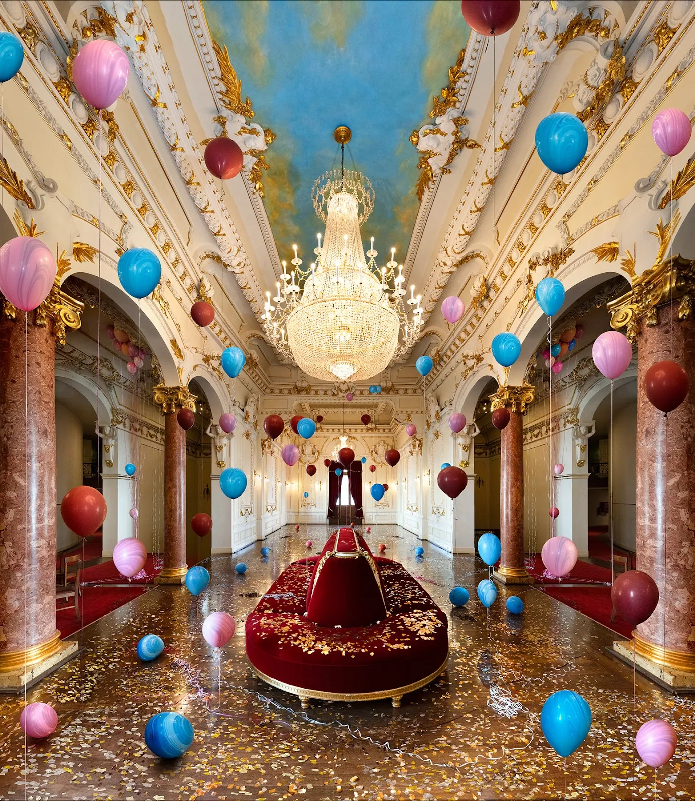 Os balões, elementos frágeis e recorrentes nas festas de aniversário de crianças, somados aos confetes ao chão, contrastam com a antiguidade do edifício centenário. O que antes poderia ser percebido como um espaço de aura intocável, ganha aqui ares de festa interrompida, de infância que invade a memória adulta.
