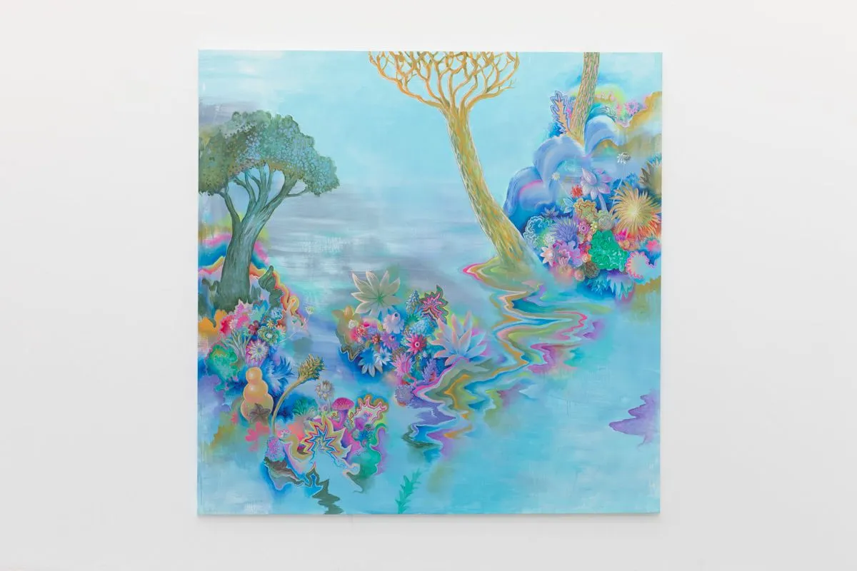 O primeiro aspecto que chama a atenção na pintura de Pedro Varela (Niterói, Brasil, 1981) é a atmosfera etérea. Na paisagem onírica, feita em acrílica sobre tela, uma vegetação que floresce em cores vibrantes é diluída no fundo azul. Nesses contornos líquidos, o artista cria seu oásis como uma miragem.