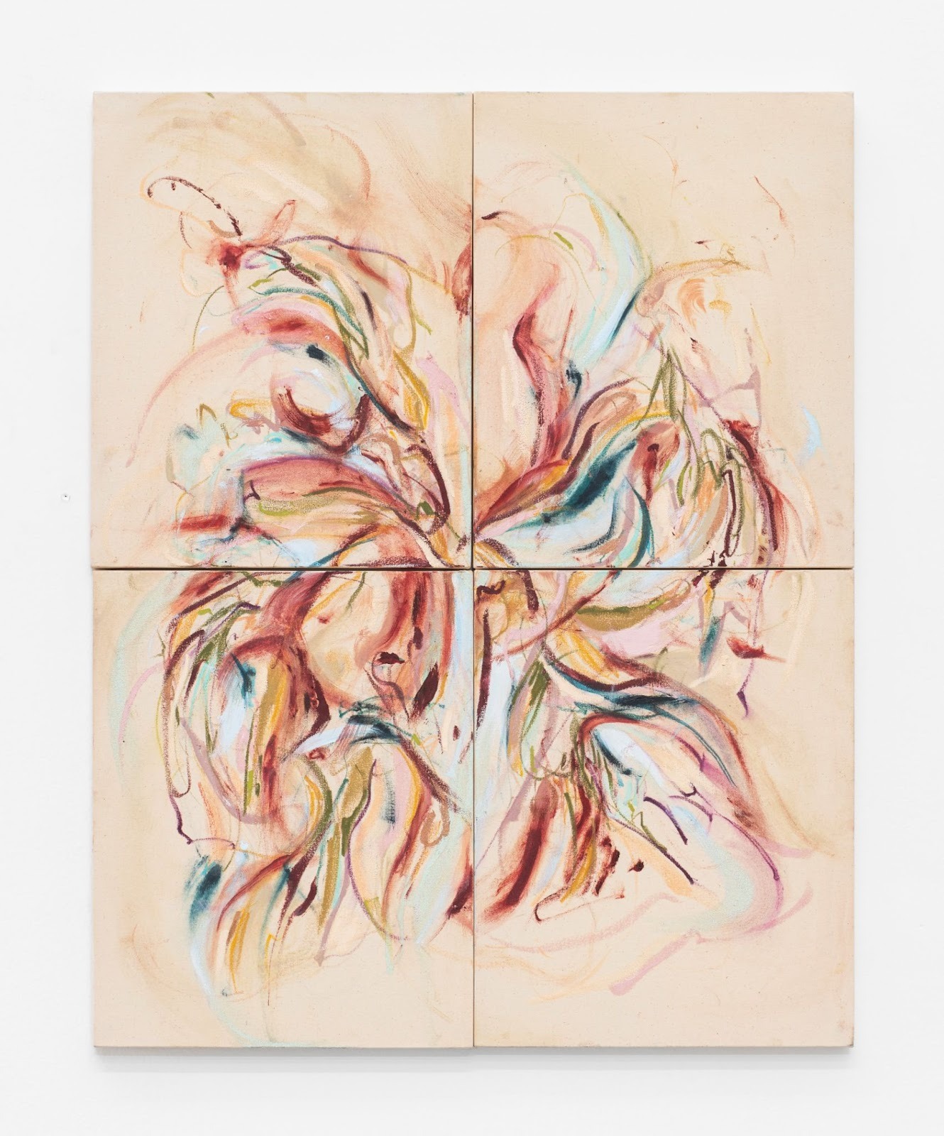 A individual de Julia Pereira na Zipper Galeria exibe um conjunto de obras recentes e inéditas, frutos de uma residência em Lisboa (Luz_Air, 2025). Lá, a artista foi tocada pelos azulejos portugueses, por sua lógica de repetição e espelhamento. Surgem, assim, seus trabalhos polípticos a partir de uma necessidade de estender a pintura para além de uma única tela. É o caso, por exemplo, de “Aparições” (2025), cuja composição foi pensada como um conjunto de fragmentos que só revelam sentido quando juntos.