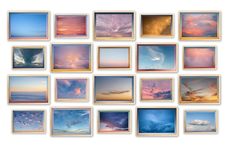 Auroras rosadas, horizontes incendiados pelo pôr do sol em azuis suaves, amarelo, laranja, lilás ou rosa. As cores e formações das vinte fotografias que compõem a instalação sugerem passagens do dia, momentos efêmeros, intensificados pela velocidade com que as condições climáticas se transformam no trópico.