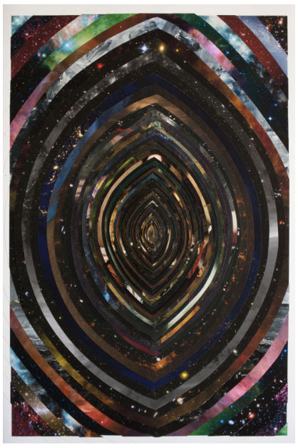 De um lado, a obra “O livro dos dias”: um diário sem narrativa linear. Uma colagem analógica, feita de sucessivas camadas em formas ovais. É no modo como essas imagens se acumulam e se sobrepõem que se constrói o sentido do trabalho. Do outro, “A longa noite”, uma segunda obra que, apesar de apresentar a mesma estrutura formal, mergulha em uma paleta mais densa, profunda e cósmica. Nesta, as imagens revelam fragmentos de céus estrelados, nebulosas e galáxias.